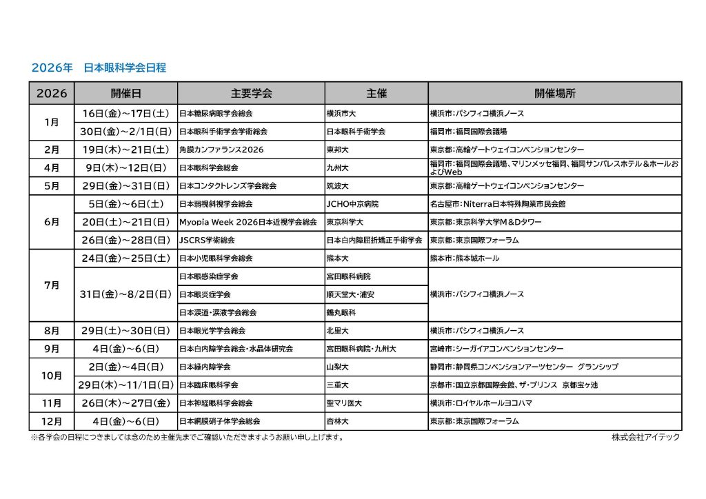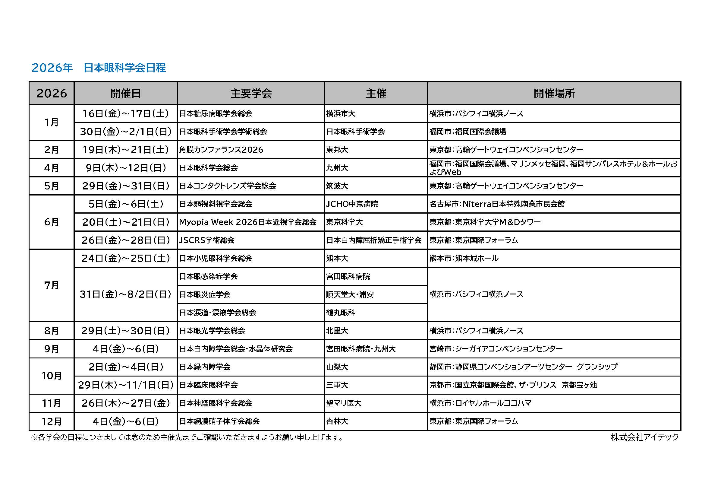 2026年眼科学会日程のお知らせ 2025年11月17日 最終更新日時 : 2025年11月5日 eyetech-contact 2026年主要眼科学会の日程についてご案内申し上げます。下記画像をクリックするとPDFファイルが開きます。
